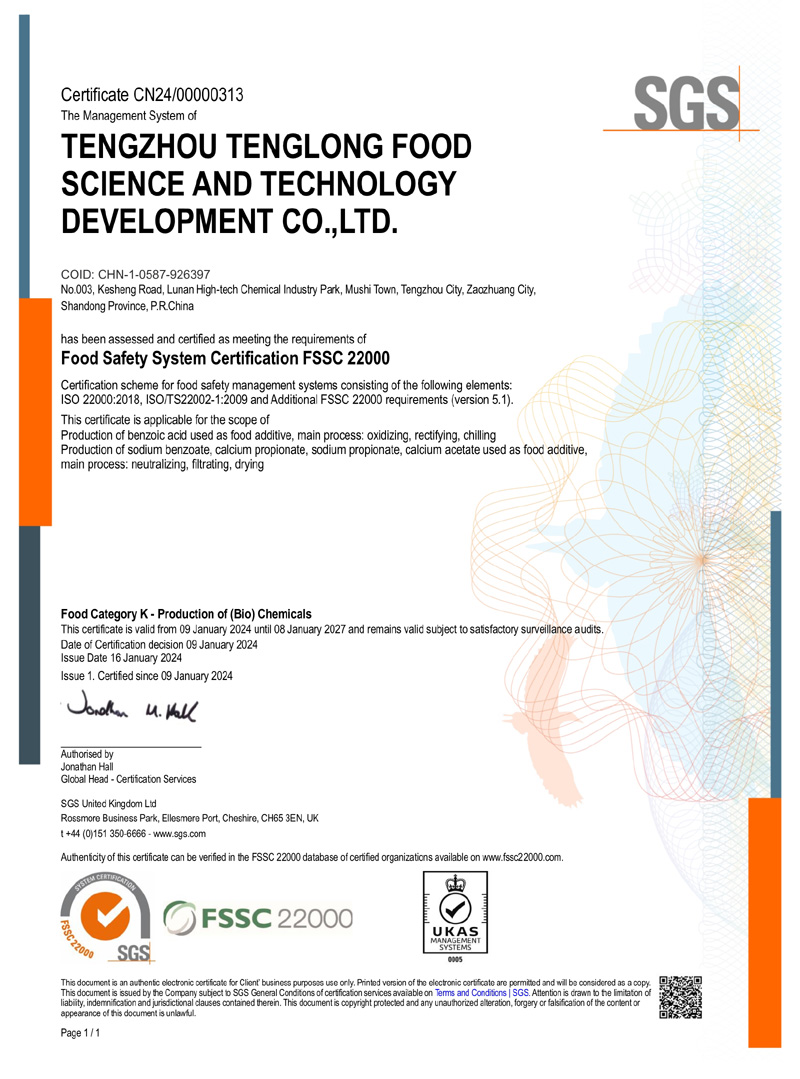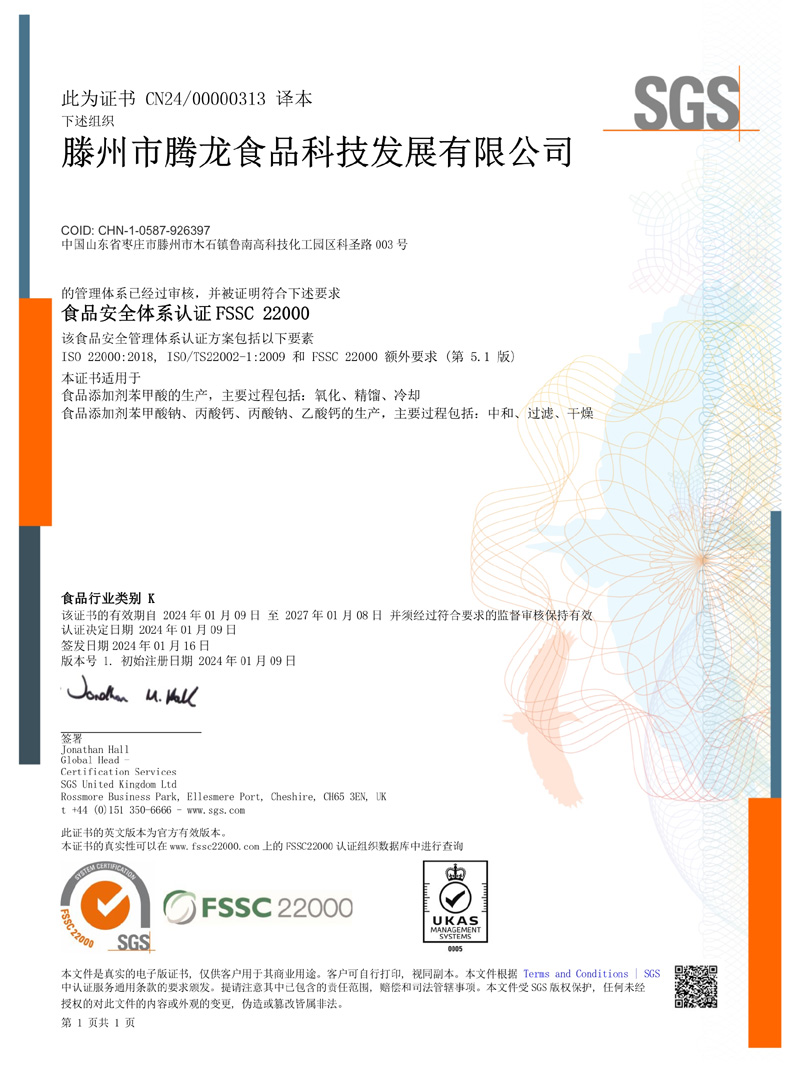 滕州市騰龍食品科技發(fā)展有限公司坐落在山東省滕州市木石鎮(zhèn)魯南高科技化工園區(qū),成立于1996年,前身是滕州市騰龍化工有限責(zé)任公司,公司專業(yè)生產(chǎn) 苯甲酸,苯甲酸鈉,丙酸鈣,丙酸鈉和醋酸鈣等系列產(chǎn)品。